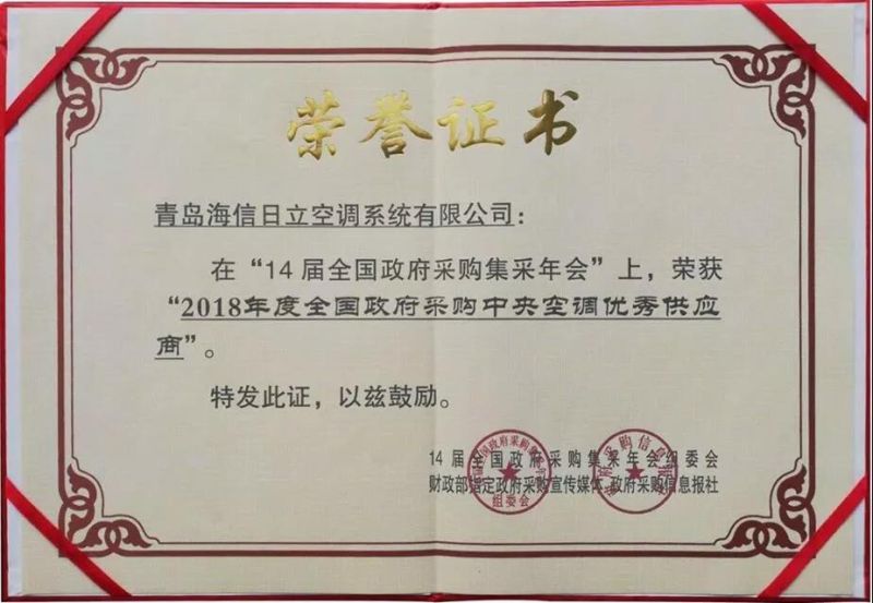 海信日立喜获 “2018年度全国政府采购中央空调优秀供应商”殊荣